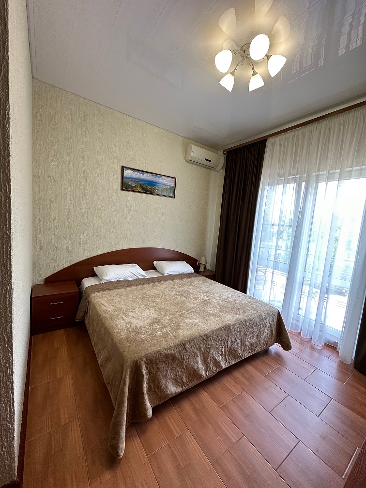 3-х местный номер стандарт с балконом площадью 24 кв /м. В номере - двухспальная кровать с прикроватными тумбами, диван, шкаф, кондиционер, телевизор, сейф. В номере также есть душевая кабина, санузел, средства гигиены, полотенце, зеркало. Все номера с балконами.